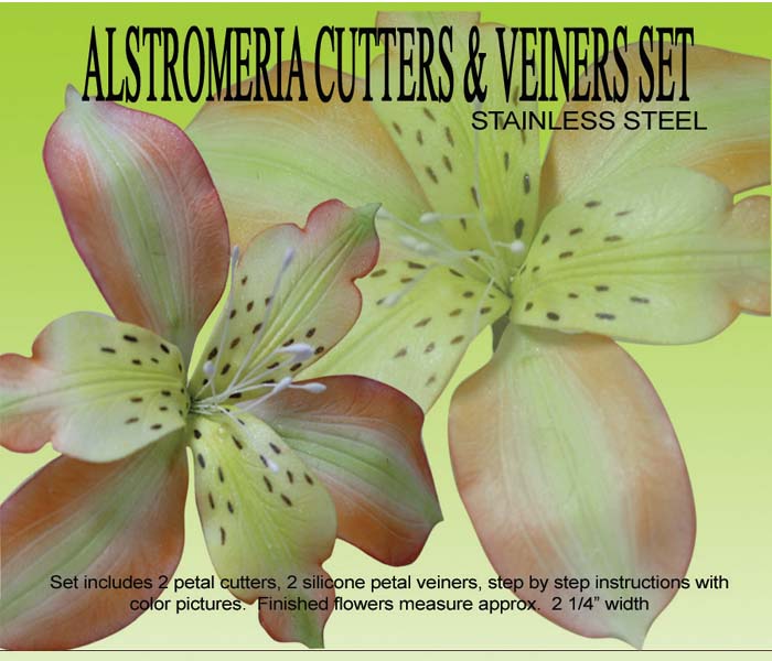 Set of 4 including 2 stainless steel petal cutters and a pair of silicone petal veiners. Includes a step-by-step instruction with color pictures. This Alstromeria gumpaste flower cutter set is life-sized. Finished flower measures approx. 2 1/2" W.